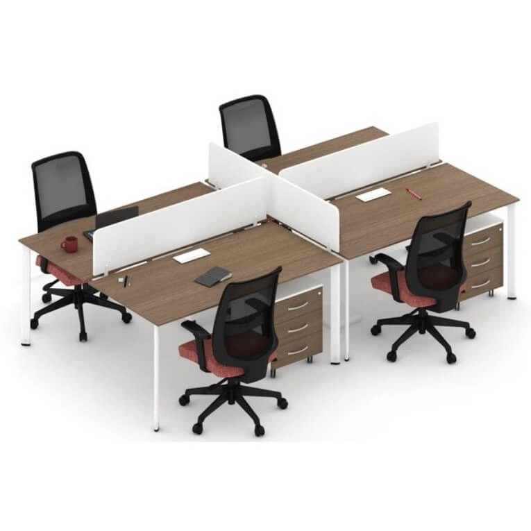 Dört yönlü yerleşimli, bölücü panelli ve mobil çekmeceli çalışma masası seti