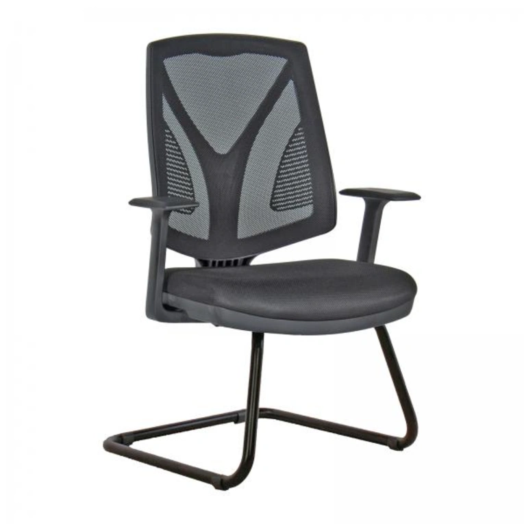 Svago misafir koltuğu, geniş oturumlu siyah file sırt ve sade U ayak gövdeli.Svago misafir koltuğu ön görünüm – file sırt, dolgulu oturum, geniş U ayak.