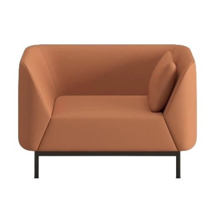 Odda tekli koltuk perspektif; köşeli ama yumuşatılmış form, homojen döşeme ve minimal taşıyıcı ayaklar