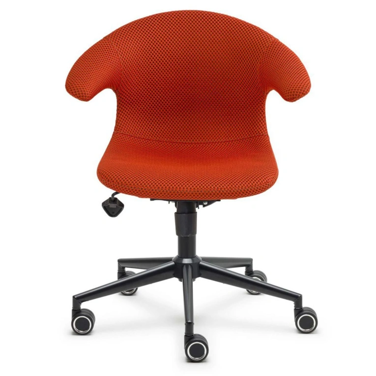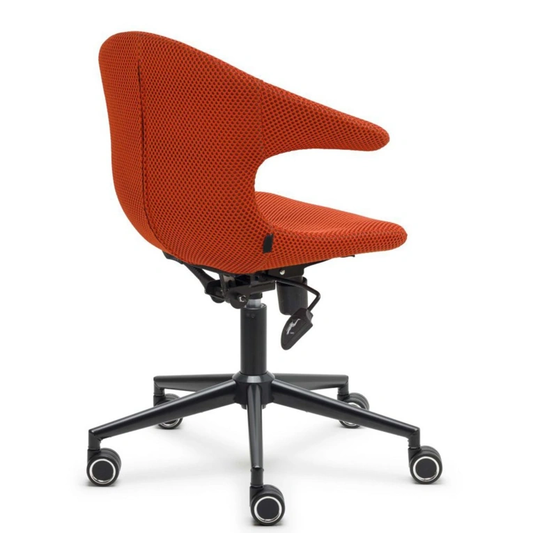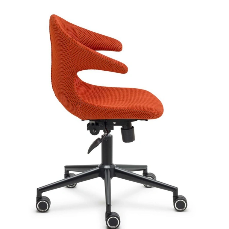 Turuncu, kıvrımlı sırt yapılı ergonomik toplantı koltuğu, açılı perspektif.