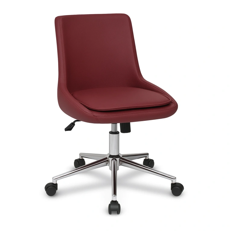 Rubra kırmızı ofis koltuğu, çapraz açıdan; akıcı kolsuz yapısı ve ayarlanabilir oturum, tekerlekli taban.