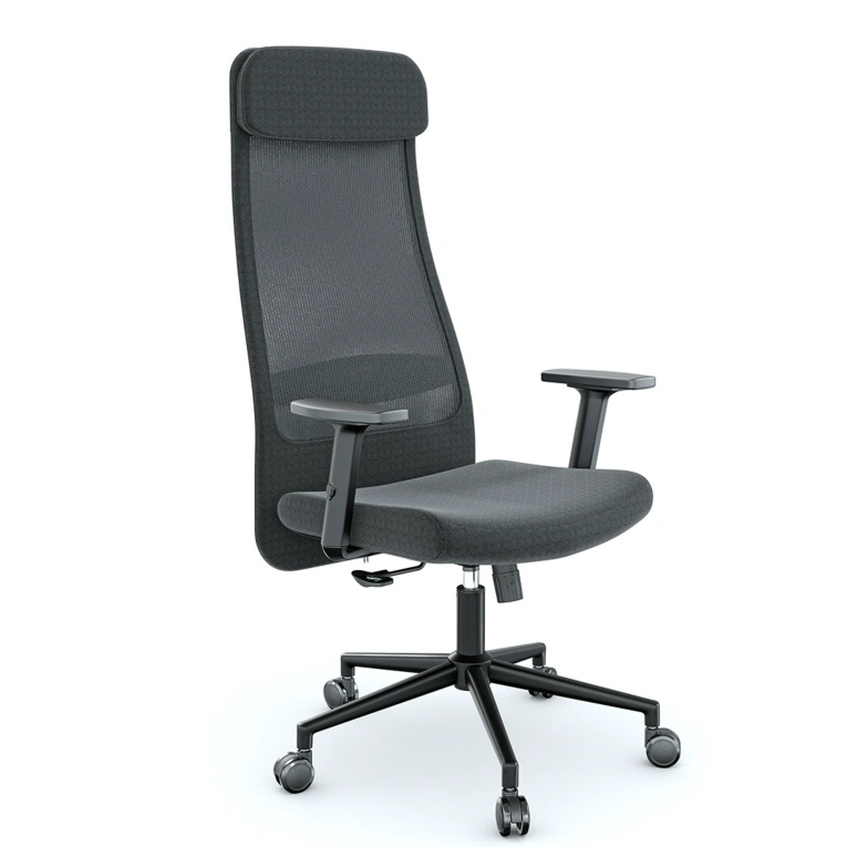 Koyu gri file sırtlı, entegre başlıklı, ayarlanabilir kolçaklı ve tekerlekli yıldız ayaklı Atlas Yönetici Koltuğu 1176 – ergonomik yüksek sırt ofis koltuğu.