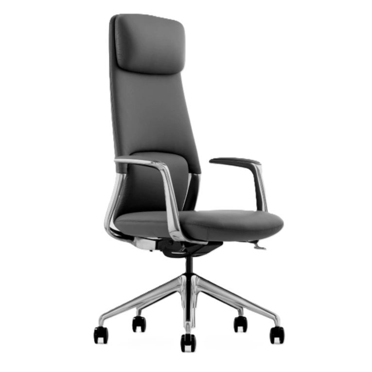 Legro yönetici koltuğu – siyah deri yüksek sırt, entegre baş yastığı, parlak alüminyum ayak ve kavisli metal kol dayama.