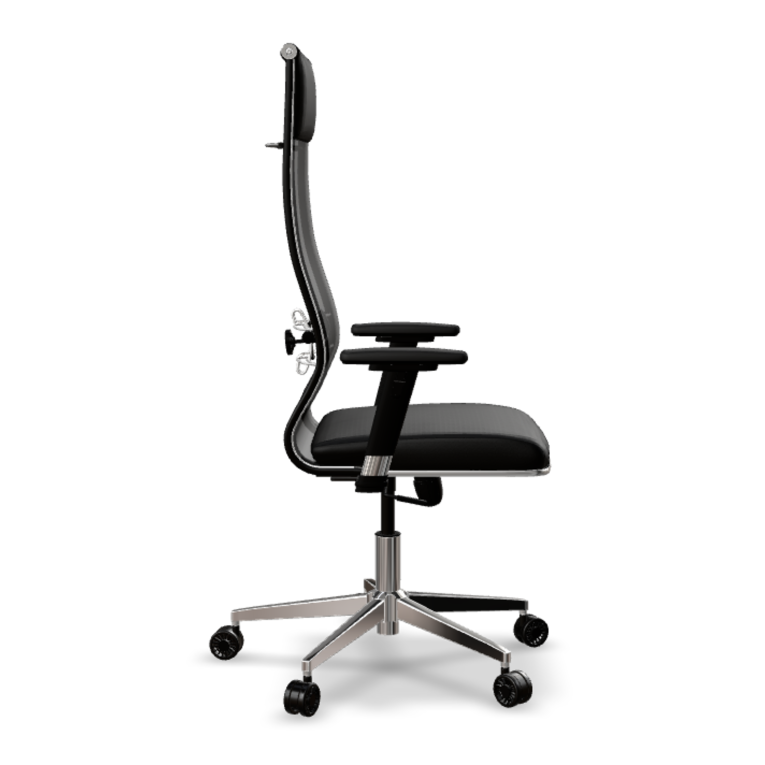EOS yönetici koltuğu sol yandan görünüm; ergonomik başlık, file arkalık, ayarlı kolçak ve alüminyum tabanlı hareketli tekerlekler.EOS yönetici koltuğu sağ yandan görünüm; eğimli file sırt, yastıklı başlık ve kademeli oturum derinliği, sessiz tekerlekli ayak üzerinde.