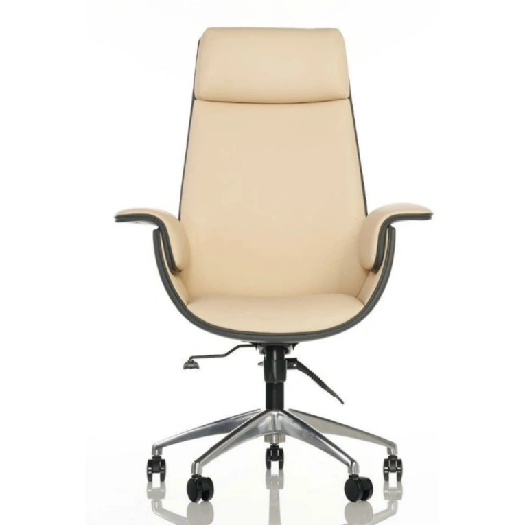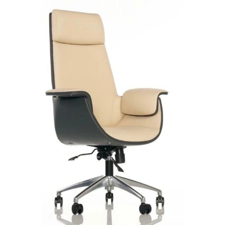Krem deri kaplama, entegre başlıklı, siyah gövdeli ve alüminyum yıldız ayaklı Velora yönetici koltuğu – yan açıdan ergonomik ofis koltuğu görüntüsü.